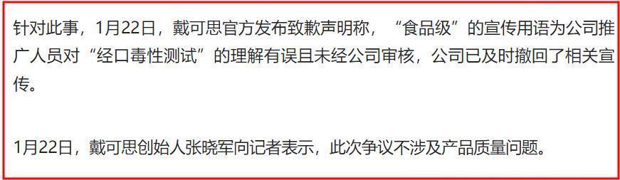 这些网友之所以这么说,是因为戴可思表示是因为公司推广人员对“经口毒性测试”的理解有误且未经公司审核而发出了招惹事端的广告语。
