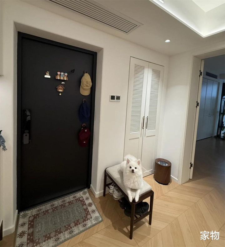 但进行返修后,不仅留出了定制玄关柜的空间,还利用矮换鞋凳隔断了玄关和收纳壁橱,更是将原本受潮变形的壁橱门改成了半扇百叶窗门,在灯光的映衬下显得干净明快了不少,空间划分也合理了许多。