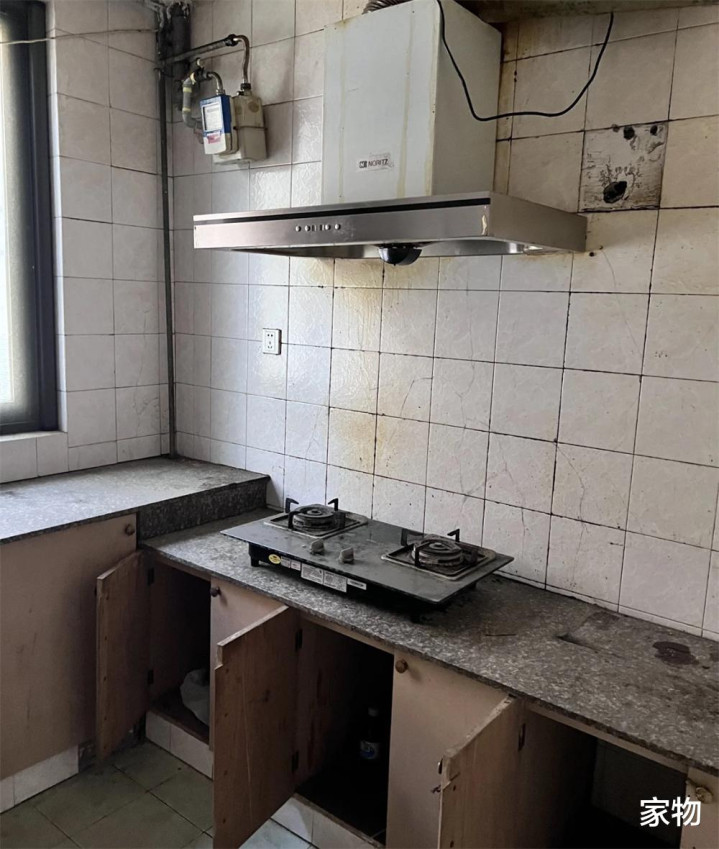 老破小的厨房就不用我多说了,基本上偶读是油污满满、橱柜脏旧的状态,甚至柜体还是那种老式的砖砌水泥+木门板组合,好不好看先放一边,单说这木门耐用性,就要打个大大的问号。