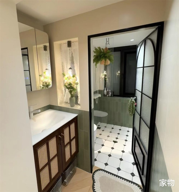 当然啦,装修过后也是将上述问题统统都解决了个遍,洗手台外移做干湿分区,直接少了一半清洁难题;里面浴室也做了半墙浴屏分隔,洗澡时能避免溅水;风格更是从老破小变成了复古风,又好看又实用。