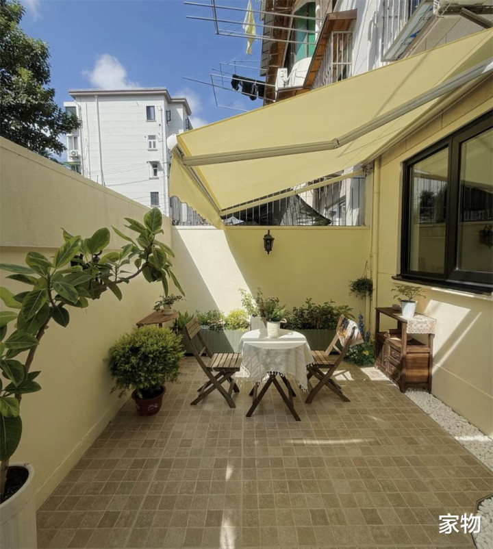 如今装修后,又放上了户外家具并安装了折叠雨棚,即便是阴天下雨,也可坐在这里听风赏雨,美哉快哉。