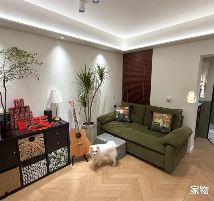 客厅就要相对少一些了,用双人位沙发+侧边柜进行布置,没有茶几和电视柜,但却也算是个舒服的休闲空间,平时在这弹个吉他、喝喝茶,或者用手机PAD等物追追剧看看电影都很舒服,小小空间功能却不少。