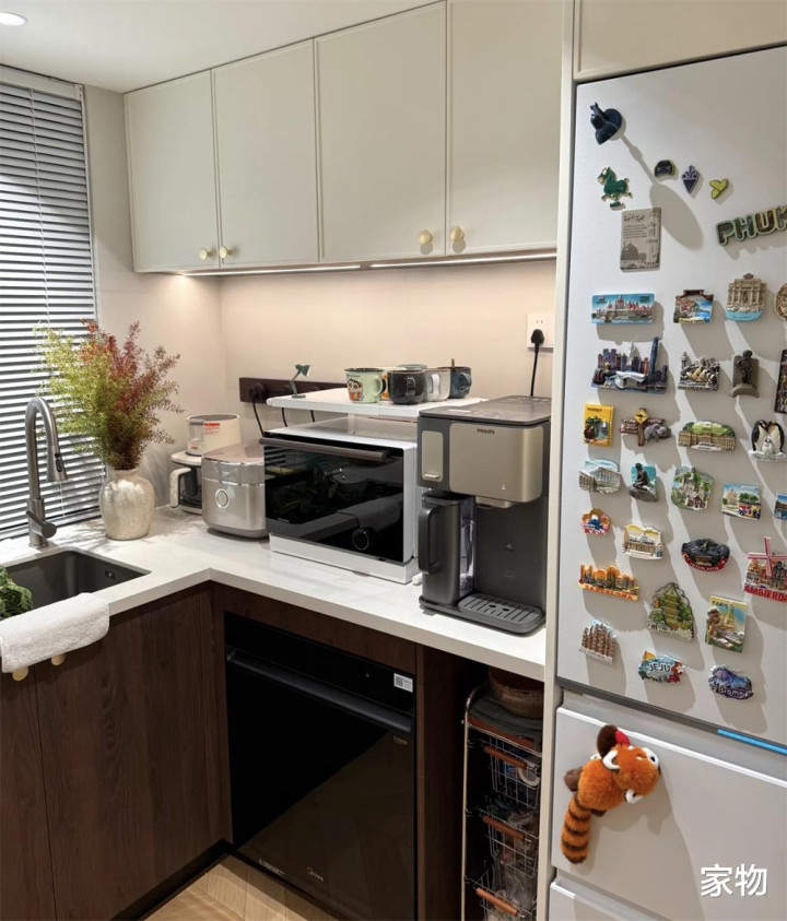 但这次翻修后,却一改以往模样,吊柜底柜全部翻修,还利用有限空间嵌入了洗碗机和冰箱、放下了烤箱和饮水器,与细节灯光相搭配,不仅更具现代化,实用性也比之前强了很多。